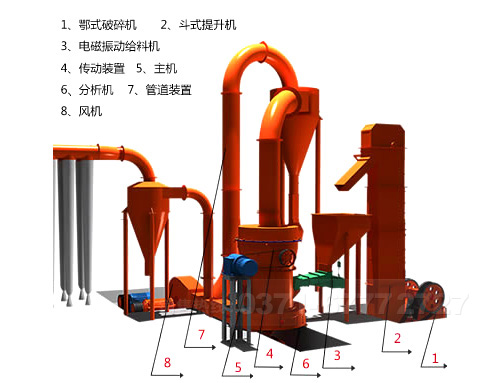 相關(guān)配置:鄂式破碎機(jī)、斗式提升機(jī)、電磁振動(dòng)給料機(jī)、雷蒙磨粉機(jī)、振動(dòng)篩等組成。
