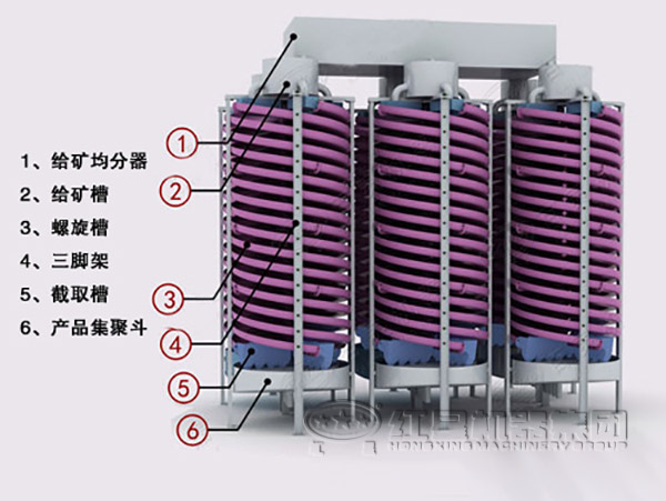 將螺旋溜槽立起,校準(zhǔn)垂直線,用鐵架或木頭固定在合適的位置,由砂泵將礦砂送到螺旋上頂兩個(gè)進(jìn)料口處,加入補(bǔ)充水,調(diào)節(jié)礦槳濃度,礦槳自然從高往下旋流,在旋轉(zhuǎn)的斜面流速中產(chǎn)生一種慣性的離心力,以礦砂的比重、粒度、形狀上的差異,通過(guò)旋流的重力和離心力的作用,將礦與砂分開,精礦流入精礦斗用管道接出,尾砂流進(jìn)尾砂斗用管道接到砂池,再用砂泵排走,完成了選礦的全過(guò)程。